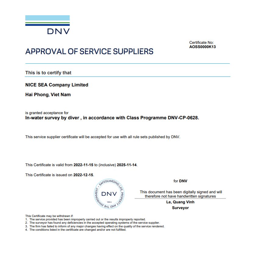 NICE SEA Company Limited. is approved by DNV class for under water service with a wide range of damage survey, purchase surveys, crack welding, propeller polishing, repair, etc., for all types of vessels…
